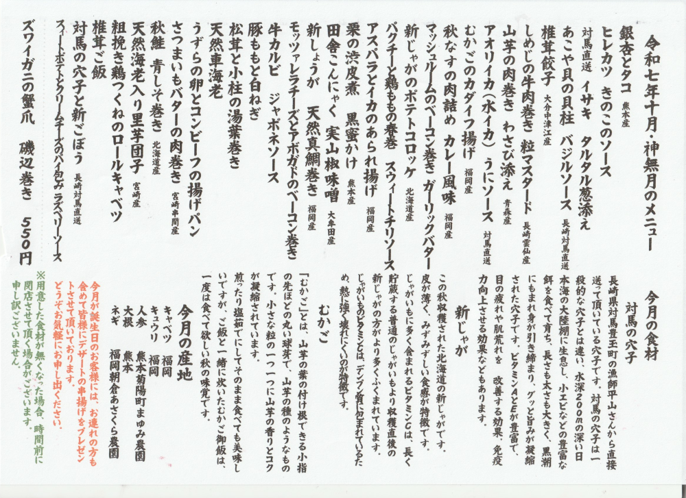 季節の野菜や魚介類、肉類など、お客様の召し上がれる早さに合わせてバランスよくタイミングよく揚げてまいりますが、『もう少し早く揚げて』『もう少しゆっくり』などお気軽にお申し付けください。 -