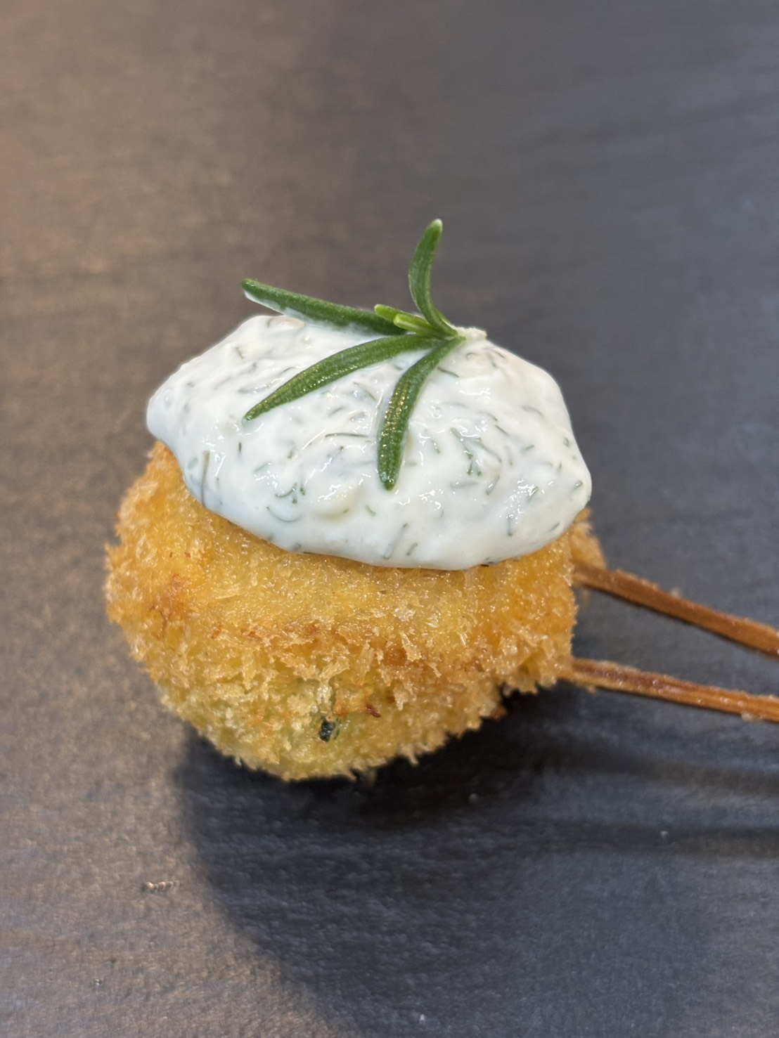 マヨネーズから手作りしている自家製のタルタルソースです。保存料や酸化防止剤など一切使わず、新鮮な卵とマスタード、酢、サラダオイルだけで作っています。使う酢の量をギリギリまで少なくすることで、作る時は苦労するのですが、出来上がったマヨネーズはとてもクリーミーでまろやかな口当たりです。この手作りマヨネーズに、ゆで卵、玉ねぎ、ピクルス、パセリを加えてタルタルソースにします。たっぷりのゆで卵を加えることで、より甘味と旨みが増します。揚げ立ての串揚げを引き立てるタルタルソースに仕上げています。 -